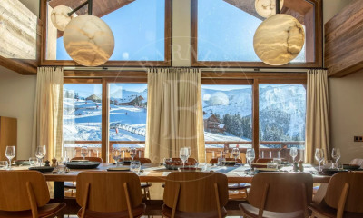 Ce duplex de 120 m², situé dans le quartier du Plateau à Méribel, bénéficie d'une terrasse sud d'environ 50 m² avec vue panoramique. Il comprend une chambre parentale avec salle de bains, un dortoir avec lits superposés et salle d'eau, deux chambres doubles avec salle de bains partagée, une cuisine ouverte sur la salle à manger, un grand salon cathédrale avec cheminée, un balcon exposé sud, un ski room privatif et un parking extérieur. Aménagement intérieur : Étage principal : Suite parentale double, dortoir en suite (2 couchages), salon avec cheminée, cuisine/salle à manger, terrasse exposée sud. Étage supérieur : Deux chambres doubles, salle de bain indépendante, toilettes séparées, petit espace détente. Services inclus : accueil, linge fourni, chaussons, produits d'accueil, ménage inclus, conciergerie dédiée. Principaux avantages : salon spacieux, bonne exposition, agencement confortable. Méribel 3 Vallées Sotheby's International Realty, spécialiste de la location d'appartements de luxe à Méribel.