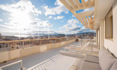 Location saisonnière - Magnifique appartement duplex de 135m² entièrement rénové aux 6ème et 7ème étages dans résidence sécurisée à deux pas de la Croisette et à 3mn du Palais des Festivals. Vue mer panoramique. 6ème étage : Entrée Toilettes invités Cuisine américaine entièrement équipée ouvrant sur salon/salle à manger. Réfrigérateur-congélateur, four, hotte, machine à café Nespresso, machine à laver, sèche-linge. Séjour avec canapé 3 places + méridienne ouvrant sur balcon exposé sud d’environ 23 m². Salle à manger équipée pour 10 personnes. Chambre maître (n°1), ouvrant sur balcon exposé sud : Lit double 160cm x 200 cm, bureau, placards Salle de bain en suite avec baignoire, double vasque et, toilettes Accès au 7ème étage par escaliers 7ème étage : Chambre n° 2, ouvrant sur terrasse sud de 50m² : Lit double 160cm x 200 cm, placards Salle de bains en suite avec baignoire, double vasque, bidet et toilettes Chambre n°3, ouvrant sur terrasse sud : Lit double 160cm x 200 cm, placards Salle de bains en suite avec baignoire, double vasque, bidet et toilettes Balcon exposé sud de 50 m². Autres prestations : WIFI Climatisation dans toutes les pièces Gardien dans la résidence Equipé pour : 6 personnes