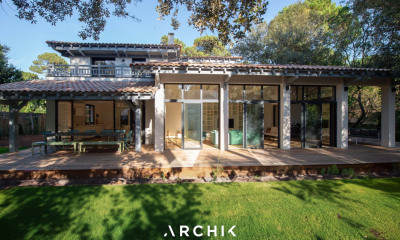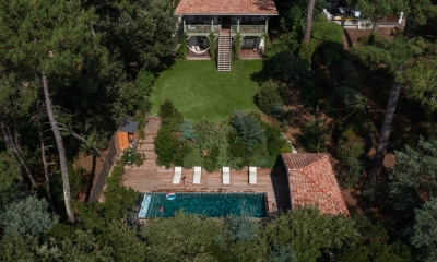 Architecture des années 80, cette maison de 280 m² est bâtie sur un terrain arboré de 2 200 m² en première ligne, au cœur du quartier Haïtza du Pyla avec son perré privatif et son accès direct à la plage.?? en retrait de la route nichée sous les pins. Pensée par un architecte italien, la maison profite de beaux volumes. En rez-de-jardin, la pièce de vie sous rampant s’ouvre sur la vue dégagée vers le Bassin et la pointe du Cap Ferret. Largement vitrée, la pièce est baignée de lumière avec l’espace repas sous une verrière, adossé à la cuisine entièrement équipée et semi ouverte. L’espace salon, face à la mer, se glisse sous une mezzanine en galerie qui surplombe l’espace de vie et sert de coin détente pour lire ou contempler la mer. Orienté vers le Bassin, le beau jardin arboré s’étend jusqu’au perré privé entièrement aménagé avec une douche de plage, une cuisine équipée, une voile d’ombrage et du mobilier pour profiter pleinement de la plage même à marée haute. Un deuxième salon avec cheminée et billard invite à la convivialité en soirée ou en mi-saison. Le côté nuit se compose de cinq chambres, une master avec salle de bain semi-ouverte, un dortoir avec quatre couchages et trois chambres doubles. Chaque chambre profite d’une salle de bain. Une buanderie et du stationnement sur le terrain complètent cette maison familiale et chaleureuse, parfaite pour des vacances à la fois paisibles et conviviales. Capacité d’accueil 14 personnes. De 3 190 € à 9 150 € la semaine
