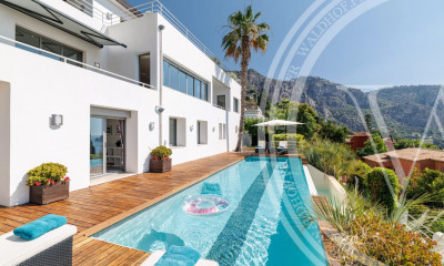Superbe villa contemporaine à Eze bord de mer avec vue mer imprenable. Située en position dominante à Eze bord de mer, cette villa contemporaine d'exception offre une vue panoramique sur la mer Méditerranée, faisant d’elle un bien rare et recherché. Construite sur trois niveaux, la villa dispose de 475 m² de surface habitable, comprenant la maison principale, les garages, le sous-sol, un poolhouse et des terrasses spacieuses. L’intérieur de la maison se compose de 4 chambres lumineuses, chacune avec sa propre salle de bains attenante, d’un double salon, d’un bureau, d’une salle à manger et d’une cuisine américaine équipée ouverte sur la terrasse, idéale pour profiter du climat méditerranéen. Grâce à ses nombreuses baies vitrées, chaque pièce de la villa bénéficie d’une vue spectaculaire sur la mer, créant ainsi une ambiance à la fois moderne et apaisante. Le terrain de 1000 m² comprend une grande piscine à débordement, un poolhouse avec cuisine d’été, plusieurs terrasses, ainsi qu’un terrain de jeux avec espace repas, parfait pour recevoir des invités. La propriété dispose également de 3 garages fermés et d’un parking privé. Caractéristiques principales : 475 m² de surface habitable 4 chambres avec salle de bains Vue mer panoramique Piscine à débordement et poolhouse parking privé Terrain de 1000 m² avec espaces extérieurs aménagés Cette villa est une véritable perle rare sur le marché de l'immobilier à Eze, offrant à la fois confort, espace et vues spectaculaires.