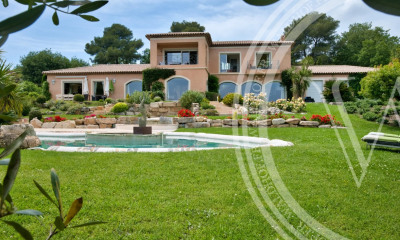 Cette très belle villa contemporaine de 430 m² proche Mougins et Valbonne, dispose d'une luminosité exceptionnelle grâce à ses énormes baies vitrées ainsi qu'une vue panoramique à couper le souffle. La villa peut accueillir jusqu'à 10 personnes dans 5 chambres avec 4 salles de bains/douches. Rez-de-chaussée : Hall d'entrée avec placards. Chambre maitre (chambre N°1) avec un lit double (180x190), une salle de bains (lavabo double vasque, baignoire, douche, toilettes indépendantes), un dressing, un bureau Chambre N°2 : lit double ou 2 lits simples (1 lit 180x190 ou 2 lits 90x190) avec une salle de douche attenante (lavabo, douche, WC) et un dressing. Chambre N°3 : lit double (180x190) avec une salle de douche (lavabo, douche, WC) et un dressing. Salle de sport. Garage. Rez-de-jardin : WC invités. Vaste salon avec un accès à la piscine Salle à manger ouverte sur le salon Cuisine entièrement équipée Chambres N°4 et N°5: lits doubles (lits de 180x190) et une salle de douche (lavabo, douche, WC) partagée Buanderie. À l'extérieur: Jardin paysagé, 4 places de parking, piscine à débordement pouvant être chauffée (10x5 mètres), poolhouse avec une cuisine d'été, barbecue, douche, jacuzzi (6 places). Les informations sur les risques auxquels ce bien est exposé sont disponibles sur le site Géorisques :