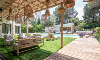 Ramatuelle, au calme, dans un environnement naturel et authentique à quelques pas des plages de Pampelonne (moins de 10mn à pied), au cœur des vignes, nous vous proposons une villa familiale entièrement rénovée avec goût et sobriété. Elle se compose de 5 chambres complètes dont 1 indépendante dans une dépendance, une cuisine équipée ouverte sur la salle à manger et le salon qui se prolongent sur une large terrasse abritée par deux mûriers et une immense pergola, avec son coin barbecue dédiée aux repas. Une deuxième aire de détente correspond à l'espace piscine (piscine chauffée 12 x 5) entourée de transats, idéale pour profiter des chaudes journées d'été dans un environnement de sérénité et de charme. Parking pour plusieurs voitures. TARIFS: - Basse saison du 12/10/2024 au 26/04/2025 : 12.500 € / semaine - Moyenne saison du 26/04/2025 au 28/06/2025 : 15.000 € / semaine - Haute saison du 28/06/2025 au 30/08/2025: 18.750 € / semaine SERVICES INCLUS EN BASSE ET MOYENNE SAISON : • Nettoyage à l’arrivée et au départ • Nettoyage supplémentaire possible à 30€/heure • Changement des draps et du linge de toilette tous les 4 jours pour les longs séjours SERVICES INCLUS EN HAUTE SAISON: • Champagne de bienvenue • Boissons non alcoolisées (eau, soda, jus de fruits, café et thé) • Petit déjeuner quotidien • Nettoyage quotidien • Changement des draps et du linge de toilette tous les 4 jours pour les longs séjours • Gestionnaire disponible sur place • Entretien et nettoyage du jardin et de la piscine tous les mercredis • Possibilité de réserver un dîner avec notre chef privé (jusqu’à 5 dîners par semaine - prix sur demande en fonction du nombre de personnes)