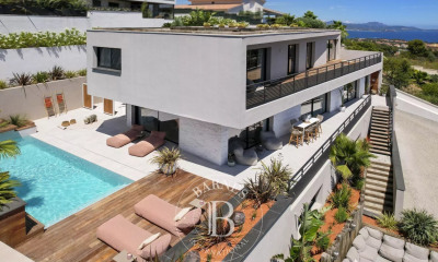 Villa contemporaine pied dans l'eau neuve, sur la Côte d'Azur, entre Cannes et Saint-Tropez. Bénéficiant d'un accès direct à la mer, et à pied des commerces, cette villa au design épuré et aux prestations haut de gamme profite d'un emplacement exceptionnel. Sur un terrain de 1239m2, elle développe une superficie d'environ 340 m2, avec notamment 4 chambres plus un appartement et des espaces loisirs. Baignée de lumière, la pièce de vie s'ouvre entièrement sur les extérieurs, et se prolonge par une grande terrasse et une piscine à débordement. Sans aucun vis-à-vis et au calme absolu, bercée par le bruit des vagues, la propriété invite à la rêverie avec sa vue spectaculaire sur la mer.. Des atouts rares pour les amoureux de la mer et d'architecture moderne.