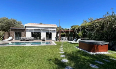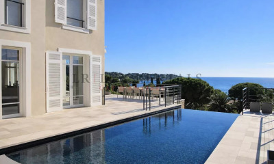 Superbe villa rénovée édifiée sur plusieurs étages et bénéficiant d'une jolie vue mer. Située sur un terrain plat avec piscine et pétanque. Domaine privé à pied des plages. Composée d'un hall d'entrée, séjour et salle à manger ouvrant sur jardin avec piscine et une terrasse ombragée, grande cuisine équipée ouvrant sur terrasse ombragée et terrain de pétanque. Une chambre en-suite. A l'étage : deux chambres en-suite, 2 chambres partageant une salle de bains, une cuisine équipée, séjour et salle à manger ouvrant sur une grande terrasse vue mer. 2ème étage : chambre de maitre avec vue mer, salle de bains et douche, grand dressing et salle cinéma. Terrasse lounge arboré. Places de parking et garage.