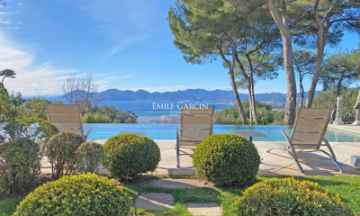 Élégante Villa de Luxe à Cannes, Nichée dans le Prestigieux Quartier Résidentiel de la Californie Située à seulement 5 minutes de la célèbre Croisette, cette villa contemporaine offre un cadre de vie exceptionnel. Érigée sur trois niveaux, cette résidence moderne séduit par son design raffiné et ses équipements haut de gamme. Avec ses 550 m² habitables, la villa dévoile une décoration sophistiquée et offre une vue imprenable sur la Baie de Cannes et les Îles de Lérins, garantissant ainsi des panoramas à couper le souffle. Dotée d'un ascenseur desservant tous les étages, la villa se compose comme suit : Au rez-de-chaussée : Un hall d'entrée s'ouvrant sur un vaste salon-salle à manger, un bureau avec terrasse offrant une vue sur la mer. Une somptueuse chambre de Maître (lit double de 180cm) avec vue sur la mer, dressing et salle de bains complète avec douches et toilettes. Une chambre (lit double de 160cm) avec terrasse offrant une vue sur la mer, salle de douches et toilettes. Au premier étage : Un chambre (lit double 160cm) avec terrasse et brasero, offrant une vue panoramique sur la mer, dressing et salle de bains complète avec douches et toilettes. Une chambre (lit double 160cm) avec vue sur la mer et salle de bains. Une suite de Maîtres d'environ 85m² (lit double 200cm) comprenant un salon, un bar, s'ouvrant sur une terrasse, dressing et salle de douches. Au niveau de la piscine : Une salle à manger, un salon TV, un salon d'été, une cuisine américaine entièrement équipée avec arrière-cuisine et office. Toilettes pour les invités. Une chambre (lit double 160cm) s'ouvrant sur une terrasse, dressing et salle de douches avec toilettes. Une buanderie et une cave à vins. La piscine chauffée, sécurisée par une couverture, invite à la détente et à la relaxation. La villa dispose également de 4 places de parking, dont 2 avec une aire de retournement, offrant ainsi un confort absolu. Deux entrées distinctes sont disponibles pour plus de commodité.