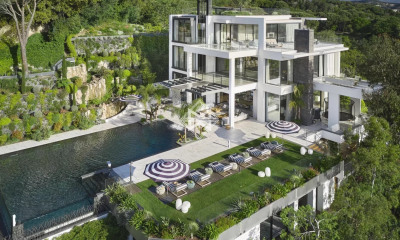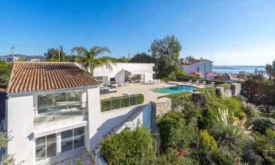 Luxueuse villa de style contemporain de 200m², 5 chambres, grand toit terrasse et piscine à débordement chauffée, magnifique vue mer, jardin de 3000m² Descriptif: Hall d’entrée spacieux ouvrant directement sur un grand séjour équipé d’un canapé d’angle et d’une télévision. Cuisine ouverte et tout équipée avec four, micro-ondes, réfrigérateur/congélateur, plaque halogène et machine à café. Toilettes invités. Chambre Maître N°1 - accès à la terrasse : lit double (180cm), dressing, télévision. Salle de bain en suite avec lavabo à double vasque, baignoire, douche et toilettes. Premier étage : Chambre N°2 - accès au jardin : 2 lits simples (2x90cm) avec dressing et télévision, salle de bain en suite avec lavabo, baignoire et toilettes. Chambre N°3 - accès au jardin : 2 lits simples (2x90cm) avec dressing et télévision, salle de bain en suite avec lavabo, douche et toilettes. Buanderie – Lave-linge, sèche-linge. Chambre N°4 - accès au jardin : lit double (160cm) avec dressing et télévision, salle de bain en suite avec lavabo, douche et toilettes. Chambre de service N°5 – entrée indépendante : 1 lit de 90cm et salle de bain en suite avec lavabo à double vasque, douche et toilettes. Autres prestations : Chaînes satellite, télévision Apple, wifi, air conditionné dans toutes les pièces, système centralisé d’alarme intérieure, caméras de sécurité. Équipée pour : 9 personnes
