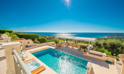 * Villa Agathe * Située dans un environnement calme et résidentiel, à 500 mètres à pied des plages, cette propriété entièrement rénovée d’environ 235 m² offre une vue panoramique sur la mer. Au rez-de-chaussée, une pièce de vie spacieuse et lumineuse avec salon et salle à manger, une cuisine entièrement équipée ainsi qu’une chambre en suite avec son armoire, sa salle de douche et son accès à la terrasse. Au niveau inférieur, quatre chambres en suite avec chacune son armoire, sa salle d’eau et son accès terrasse donnant sur la piscine Un espace cinéma ainsi qu'un dortoir pour enfant viennent compléter le bien. En extérieur, de larges terrasses aménagées, une piscine, un espace ombragé avec barbecue. Équipements : Climatisation dans toute la propriété, places de parking, piscine chauffée, plancha, terrain de pétanque, table de ping-pong. Service inclus : Ménage, linge de maison et service de conciergerie BARNES personnalisé. N°83115004738SB