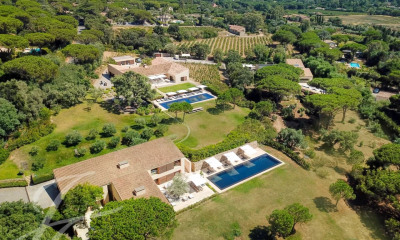 A mi-chemin entre la place des Lices et la plage de Tahiti dans le secteur prisé de la Belle Isnarde, une charmante propriété provençale rénovée avec modernité, composé d'une villa principale de 4 chambres en suite, d'une maison d'invités disposant de 2 suites invités et d'une maison de gardien (2 couchages) sur 4 800 m2 de terrain arborés et paysagés d'essences méditerranéennes, donnant sur les vignes, la baie des Canoubiers et le Château Borelli. C'est le designer allemand Hans Peter Proff qui est en charge de la décoration, proposant un style fusion mêlant inspiration Bohême chic, mobilier de créateurs Italiens, une touche ethnique sans oublier d'intégrer le tout dans un environnement provençal. Cette propriété saura vous séduire grâce à ces grands volumes et son cachet. Équipements: Emplacements voitures, terrain de pétanque, piscine chauffé, salle de sport Tehcnogym, système son SONOS, barbecue Weber, bar extérieur..