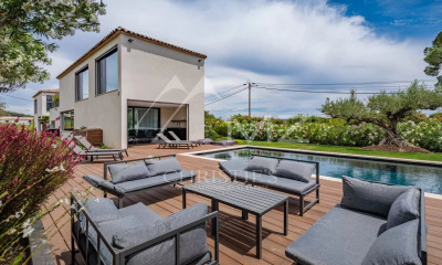 Pleine de charme, cette villa de plain-pied entièrement rénovée est l'endroit idéal pour des vacances paisibles en famille, dans un cadre champêtre à proximité directe de la plage et du centre-ville. Elle offre de beaux et lumineux espaces de vie, ainsi que 5 chambres en suite dont une somptueuse chambre de maître et 2 chambres indépendantes. Numéro d'agrément : 83119004688AK