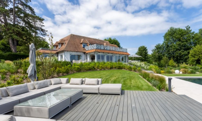 Sur les hauteurs de Deauville, superbe propriété en position dominante avec une vue panoramique sur la mer et la côte normande. Vous serez enchanté par le chant des oiseaux et les perspectives apaisantes. Nous vous proposons une maison principale comme suit En Rez de chaussée: - une Entrée - un Sséjour cathedrale avec vue panoramique sur la mer - une salle à manger avec vue panoramique sur la mer s'ouvrant sur une terrasse équipée d'une salle à manger exterieure et son barbecue. - une cuisine entièrement équipée - une chambre de maître avec vue panoramique sur la mer avec son dressing et sa salle de bains avec hammam et son toilette - 1 WC invités Au 1er étage: - un salon télé / bibliothèque ouvrant sur une grande terrasse avec vue panoramique sur la mer - une chambre double vue mer ouvrant sur une grande terrasse avec vue panoramique sur la mer -une chambre Queen - une salle de douche (avec bain) - un toilette Au sous sol: - une grande salle de cinéma - une salle de jeux avec babyfoot et backgammon - une buanderie - une terrasse avec table de ping pong Une maison d'invités climatisée avec vue mer se compose: - d'un salon avec une cuisine ouverte équipée - de deux chambres - d'une salle de douche - d'un toilette invités Une immense piscine (15x5) chauffée équipée d'un volet de sécurité complète ce bien. La propriété a entièrement été refaite avec des prestations haut de gamme. Elle a été équipée pour le confort de ses hôtes afin de passer un séjour inoubliable. Vous pourrez stationner plusieurs voitures dans le domaine.