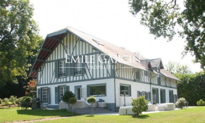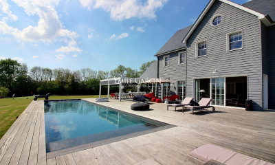 Proche des plages de Deauville, villa anglo-normande très lumineuse à l’aménagement contemporain offrant une vaste pièce de vie avec salle à manger / salon avec terrasse vue sur le jardin, cuisine, toilettes invités et vestiaire. Au premier étage, une chambre double avec terrasse privative, salle de douche et toilettes ainsi qu’une autre chambre double. Au second, deux chambres doubles et une salle de bain avec toilettes. En sous-sol une salle home-cinéma, buanderie, une salle de douche et toilettes. Un joli jardin paysager planté de pins avec terrasses aménagées est propice à la détente. Pour compléter ce bien, une maison d’amis est composée d’une pièce de vie avec kitchenette et une chambre double avec salle de douche et toilettes. Idéal séjour en famille