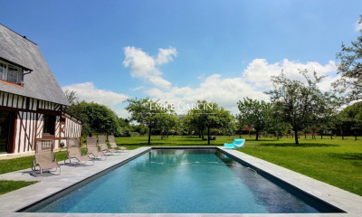 Au coeur du Pays d'Auge, entre Pont l'Evêque et Honfleur sur un parc de 10 hectares, magnifique propriété composée d'un château du XVIIIème à la décoration raffinée et son orangerie. Le château est composé d'une entrée menant vers une salle à manger et un salon avec cheminée, cuisine avec entrée de service. Au premier étage, une suite de maître avec cheminée et sa salle de bains/douches et une chambre double avec salle de bains. Au second, une chambre double, une chambre avec deux lits simples, une salle de bains ainsi qu'une salle de douches. L'Orangerie est composée d'un vaste salon menant vers une terrasse, cuisine, buanderie, cellier. Au premier étage, une chambre double avec salle de bains ainsi que deux chambres avec deux lits simples. En intersol, une chambre double avec salle de douches. Un véritable havre de paix à seulement 20 mn de la plage. A votre disposition : piscine et son pool house, tennis, aire de jeux pour les enfants. Idéal pour un séjour en famille ou entre amis. Possibilité de privatiser le domaine.