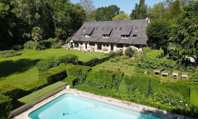 Vauville, remarquable propriété au cœur d’un parc de 8 ha. La maison offre en rez de chaussée une cuisine / salle à manger conviviale, un confortable salon avec vue sur le parc, billard et grande cheminée, un bureau et un second petit salon suivi d’une chaleureuse chambre double avec bain. Au 1er étage, une spacieuse chambre double avec bain, deux chambres double avec chacune leur douche. Au 2nd étage, une chambre double avec bain, un spacieux salon tv. Le bien se complète d’une jolie piscine à l’abri des regards, d’un salon d’été avec terrasse ouverte sur le parc et le plan d’eau. Charme et confort dans un calme absolu pour des séjours proche de Deauville.