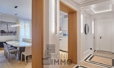 TRIANGLE D'OR - Immeuble de très haut standing avec conciergerie 24h/24, piscine, sauna, hammam, salle de sport. Cet appartement au 5ème étage, meublé de 160m² aux prestations très luxueuses, se compose d'une entrée, d'un salon, d'une salle à manger avec sa cuisine dinatoire, de 3 suites ayant chacune leurs salles de bains et leur dressing. Il dispose également d'un balcon filant offrant une vue imprenable sur la Tour Eiffel. Cet immeuble est entièrement consacré au luxe, au bien-être, et à la sérénité. Enfin un art de vivre à la Parisienne.