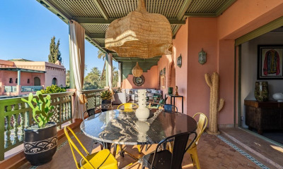 À vendre – Appartement de charme au cœur de la Palmeraie de Marrakech Idéalement situé dans l’une des résidences les plus prisées de la Palmeraie, cet appartement de 133 m² dont 53 de terrasses allie élégance, confort et sérénité. Niché au premier étage, il bénéficie d’une superbe terrasse offrant un cadre de vie privilégié, baigné de lumière et ouvert sur un environnement verdoyant. L’appartement se compose de deux chambres spacieuses, de deux salles de bain modernes entièrement équipées, ainsi qu’un séjour convivial qui se prolonge harmonieusement vers l’extérieur. Entièrement meublé avec goût, il dispose de la climatisation et de tout le confort nécessaire pour une installation immédiate. La résidence, fermée et sécurisée 24h/24, propose à ses résidents une magnifique piscine entourée de jardins luxuriants, invitant à la détente et au bien-être. Ce bien rare conjugue raffinement et tranquillité dans l’un des plus beaux quartiers de Marrakech, et représente une opportunité aussi bien pour une résidence principale que pour un investissement locatif haut de gamme.