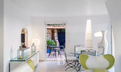 Comme une maison, baignée dans la verdure sur un jardin et terrasses de plus de 1100m2, cet appartement en duplex de 200m2 a gardé l'origine architecture-sculpture de Jacques Couelle. Il est composé au rez-de-jardin d'un grand séjour/salle à manger, une cuisine équipée indépendante mais avec ouverture possible pour un plus grand espace à vivre et convivial, une chambre avec salle d'eau, un coin bureau. A l'étage supérieur : Trois chambres avec salle de douche/wc et accès à une vaste terrasse avec vue mer Deux entrées possibles avec une qui bénéficie d'un droit à la jouissance privative d'une voie d'accès pour voitures. Dans un domaine entièrement sécurisé par des gardiens 24/7 et pied dans l'eau , 2 piscines dont une eau de mer et une chauffée, sauna, hammam, 2 salles de fitness, 2 courts de tennis, hôtel, restaurants, terrain de jeux, plages aménagées et port privé.. Un paradis à 30 minutes de Cannes à voir absolument!
