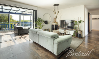 Au 1er et dernier étage, bel appartement de 82 m² environ -entrée, -cuisine contemporaine entièrement équipée, -arrière-cuisine (cellier et buanderie) -séjour lumineux avec poële -terrasse de 15m² environ avec jacuzzi, -deux chambres spacieuses, avec chacune sa salle d'eau, -Résidence récente avec ascenseur. EI Delphine SCALESE