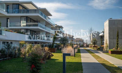 Situé à proximité du centre-ville d’Évian-les-Bains, cet appartement au 1er étage d’une résidence moderne construite en 2023 bénéficie d’un environnement calme, tout en étant proche des commodités. L’appartement s’ouvre sur une entrée avec dressing, menant à une vaste pièce de vie climatisée de plus de 38 m². Les baies vitrées, d’une belle hauteur, offrent un accès direct à une terrasse avec vue sur le lac. La cuisine haut de gamme, entièrement équipée, donne sur un balcon exposé à l’ouest. Une buanderie fonctionnelle complète l’espace, avec emplacement pour lave-linge, congélateur et cave à vin. La partie nuit comprend une suite parentale avec salle d’eau, deux chambres supplémentaires et une salle d’eau indépendante. Les chambres donnent sur un jardinet exposé plein sud. L’appartement est complété par une cave, une place de parking en sous-sol et un garage PMR d’environ 25 m², équipé d’un éclairage et d’une prise pour véhicule électrique.