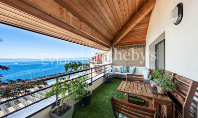 EVIAN SOTHEBY'S INTERNATIONAL REALTY vous propose : Amphion les bains, au calme : rare Appartement en duplex en dernier étage d'une résidence 'pieds dans l'eau' avec un accès direct au lac depuis le parc privé de la résidence. Appartement de type 5 en duplex et vue sur le lac, comprenant au premier niveau : une entrée, une cuisine équipée semi-ouverte, un salon, une chambre, une salle d'eau et un WC. une salle de jeux ou chambre. Au second : 2 chambres, un bureau (mezzanine ouverte), une salle de bains et un WC. Le bien dispose également d'un box garage. EVIAN SOTHEBY'S INTERNATIONAL REALTY, VOTRE EXPERT DANS LA VENTE DE PROPRIÉTÉS DE LUXE SUR EVIAN ET SES ENVIRONS.