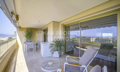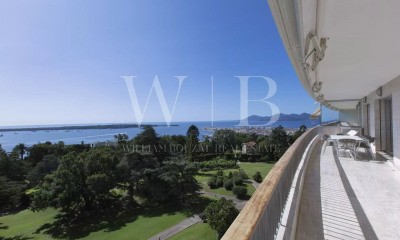 Cannes - Californie. Appartement traversant de 210 m², 5 pièces, situé au 4e étage d'une résidence de haut standing avec piscine et gardien. Très grande pièce de vie lumineuse : salon, salle à manger, cuisine. 4 chambres, 4 salles de bain, buanderie. 2 terrasses, dont une d'environ 40 m² avec vue panoramique sur la mer. Entièrement rénové avec des matériaux de très haute qualité. 2 garages en sous-sol, 1 cave.