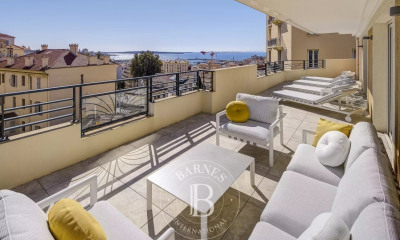 QUARTIER STANISLAS. DEUX-PIÈCES AVEC VUE MER PANORAMIQUE. En étage élevé avec ascenseur, au sein d’un splendide immeuble bourgeois du XIX? siècle, ancien hôtel historique, bénéficiant d’un parc arboré sécurisé de 1,5 hectare avec gardien, situé à environ 500 mètres des restaurants, boutiques et plages du Midi. Très lumineux et doté d’un cachet rare, l’appartement profite d’une belle hauteur sous plafond de 3,20 m et d’une vue mer époustouflante, s’étendant des îles de Lérins jusqu’au massif de l’Estérel. D’une surface de 60 m², il se compose d’une entrée, d’un vaste séjour, d’une cuisine indépendante, d’une chambre et d’une salle de douche avec toilettes. Ce bien se distingue par son emplacement privilégié au sein d’une résidence de caractère, offrant une vue véritablement unique. Une opportunité rare sur le secteur. Une cave est comprise dans le prix. Possibilité d'acquérir en sus du prix : - Sur le même palier, une chambre de service de 9,09 m² avec kitchenette, douche et espace nuit en mezzanine offre de multiples possibilités : bureau, espace indépendant ou logement étudiant. - Une place de parking privative en sous-sol