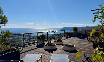 Perché au dernier étage, ce bien rare se vit comme une maison tournée vers l'horizon. L'entrée s'ouvre sur un vaste séjour baigné de lumière, prolongé par une terrasse en bois exotique où le regard se perd entre ciel et mer. La vue panoramique, omniprésente, confère à la pièce une atmosphère apaisante, sublimée par des aménagements sur mesure qui allient esthétique et fonctionnalité. La cuisine, contemporaine et immaculée, se distingue par ses finitions raffinées et son plan de travail en granit noir, apportant une note de caractère et d'élégance. Côté nuit, l'intimité est préservée : trois chambres confortables, dont une suite parentale avec dressing et salle de bain privative ouverte sur la mer. Les deux autres chambres, tournées vers la verdure environnante, partagent une salle d'eau sobre et moderne. La terrasse, véritable jardin suspendu, a été pensée comme une succession d'espaces de vie : salons extérieurs, coin repas convivial, alcôves ombragées. La végétation méditerranéenne, luxuriante et colorée, insuffle une ambiance de voyage et de dépaysement. Deux box fermés et une cave complètent cet appartement d'exception, avec la possibilité d'acquérir un troisième box. Contact : Laura LEVY +33 (0)6 98 61 21 21