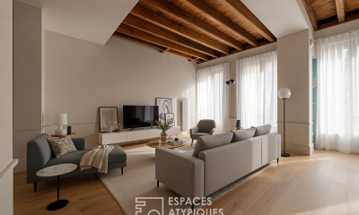 EXCLUSIVITÉ ESPACES ATYPIQUES Niché entre l'Hôtel de ville et le marché, au troisième et dernier étage d'un des plus vieux immeubles du centre Rochelais, cet appartement a fait l'objet d'une rénovation chaleureuse et contemporaine. Au sein de ce bâtiment classé, dépourvu d'ascenseur pour préserver son âme, un escalier du XVIème siècle invite à un voyage à travers l'histoire afin d'atteindre le troisième étage, uniquement réservé à ce duplex. Une entrée séparée permet une arrivée confortable et confidentielle. Le salon lumineux avec ses quatre fenêtres de toit, profite de volumes généreux. Dans un pur esprit loft, la cuisine ouverte s'articule harmonieusement autour de son îlot central. Une attention particulière a été portée à la noblesse des matériaux ainsi qu'à l'intégration de multiples rangements conçus sur mesure. A ce niveau, deux chambres dissimulées derrière le couloir, avec chacune leur fenêtre, placard, et décoration propre. Une salle d'eau, équipée d'une double vasque et d'une douche spacieuse, vient parfaire cet espace, qui bénéficie également de nombreux aménagements. Nichée sous la charpente, dominant le séjour, la suite parentale se découvre en un espace intime. Elle accueille un bureau et une salle de bains qui dialogue avec les poutres apparentes, tout en offrant une perspective spectaculaire sur les volumes historiques du salon. A proximité immédiate du marché, des arcades, du vieux port et de la gare, cet appartement de caractère sera le point de départ idéal pour profiter pleinement des charmes de la ville. CLASSE ÉNERGIE : E / CLASSE CLIMAT : B. Montant moyen estimé des dépenses annuelles d'énergie pour un usage standard, établi à partir des prix de l'énergie de l'année 2021 : entre 2 330 € et 3 190 €. Contact : Emile SOURICE - Agent Commercial (EI) - RSAC La Rochelle n°904 100 823 Copropriété de 9 lots - dont 7 lots habitation. (Pas de procédure en cours). Charges annuelles : 1800.00 euros. Emile SOURICE (EI) Agent Commercial - Numéro RSAC : 904 100 823 - La Rochelle.