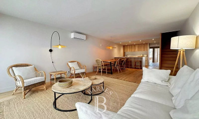 Architecture vernaculaire, cette résidence tout juste réhabilitée et transformée en 4 appartements par l’architecte Antoine Dolbeau est revêtue d'un bardage noir souligné de volets et d’éléments de charpente vert. Elle accueille en son premier et dernière étage un duplex de 120 m² et sa terrasse de 80 m² entouré de pins et à proximité de la plage au cœur de la presqu'ile du Cap Ferret. Repensé avec des prestations haut de gamme, l’appartement se vit comme une maison sur pilotis. A l’intérieur, un plan fonctionnel dévoile au premier niveau la cuisine entièrement équipée avec cellier attenant séparé de l’espace de vie par un bar. Cette pièce à la double orientation Sud Est, s’ouvre sur la nature avec de grandes baies vitrées qui accueillent le soleil levant mettant en valeur les soubassements et moulures bois aux teintes sablées qui reflètent les tonalités de la dune. L’immense terrasse entourée d’un garde-corps bois permet plusieurs aménagements pour profiter pleinement de la nature omniprésente. À l’étage le sol en chêne reste le fil conducteur et mène à une master ainsi qu’à deux chambres qui se partagent une salle d’eau, le tout sublimé par des rangements en menuiserie et des percées visuelles vers la cime des pins. Une cave privative idéale pour les affaires de plage ainsi que deux places de stationnement sécuriséesviennent parfaire ce bien. Un lieu lumineux et apaisé, où la nature s’invite à chaque instant, prêt à accueillir ses nouveaux habitants. Son sentiment de liberté La vue sur les pins La luminosité exceptionnelle