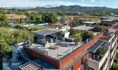 Fréjus, secteur résidentiel, Vente appartement neuf, dernier étage, 4 pièces de 82m² avec terrasse de 12m² et une terrasse sur le toit de 62m², offrant une belle vue mer. L'appartement présente une belle pièce de réception avec sa cuisine semi-ouverte. Il comprend 3 chambres, dont une suite parentale avec salle d'eau, une salle de bain, toilettes. Situé dans un environnement calme, cet appartement est très clair par son exposition et bénéficie également de frais de notaire offerts. Un double stationnement est inclus pour votre confort. Copropriété de 44 lots (Pas de procédure en cours). Charges annuelles : 2640.00 euros.
