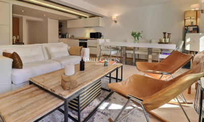 Dans résidence sécurisée avec gardien, à pieds au village et 5 minutes de la place des lices et des commerces. Superbe appartement 4 pièces vendu rénové (travaux en cours de finition). Ce bien se compose : Au niveau RDC : d’un séjour lumineux avec une cuisine neuve américaine entièrement équipée avec cave à vins, salon/séjour, un WC invité. Une suite parentale avec placards et salle de douche avec wc. Le tout donnant sur un extérieur végétalisé au calme d'environ 100m2 comprenant une terrasse en bois de 40m2. Au niveau inférieur : vous trouverez 2 pièces dont une chambre avec salle d'eau et wc et la seconde pouvant faire office de chambre. Avec une deuxième porte palière. L'appartement est équipé d'une climatisation réversible dans toutes les pièces. De plus, l’appartement bénéficie d'un accès à une piscine commune ainsi que d'un parking double extérieur et d'une cave. Il est possible d'acquérir le bien meublé.