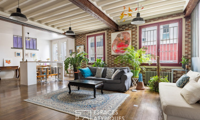 Architecture industrielle de 1910, l’ancien site de la manufacture de meubles Hagmann se révèle derrière une palissade en bois clair qui préserve le calme du passage. Réhabilité en 2016 par l’architecte Romain Armand de l’agence Studio Combo, le lieu conserve la majestueuse charpente métallique de type Eiffel qui couvrait autrefois les ateliers. Sa couverture supprimée laisse désormais entrer la lumière, offrant une respiration verticale et un jeu d’ombres qui accompagne les saisons. C’est dans cet ensemble que se découvre un loft de 92 m2. Une cour pavée rythmée par des lames de bois, des bambous et des luminaires sphériques suspendus, comme un sas végétal, mène à l’appartement. Une terrasse privative ouverte sur la cour permet la jonction entre extérieur et intérieur qui se devine derrière une spectaculaire verrière atelier en métal noir. Le loft déploie une double hauteur baignant la grande pièce à vivre d’une lumière d’Est. Le parquet en chêne clair et les poutres en bois laissées apparentes réchauffent l’esthétique industrielle ; salon, salle à manger, cuisine se répondent dans un même mouvement fluide. Une buanderie et une salle d’eau complètent le niveau. L’escalier mène à l’étage nuit. La chambre principale se pare d’un papier peint végétal. La salle de bain, entièrement rénovée, combine carrelage structuré ton sable et carrelage blanc brillant. Deux chambres supplémentaires en double hauteur aménagées de mezzanines bordées d’un garde-corps en câbles métalliques et accessibles par des pas japonais accueillent chacune un espace nuit avec vue plongeante sur la cour à travers les grandes ouvertures vitrées. Le sol en parquet et les rangements intégrés en font un espace idéal pour un enfant ou un bureau. Une quatrième chambre à aménager au premier niveau est envisageable. L’accès à une salle de sport et une piscine privée réservée à la copropriété constituent un environnement privilégié au cœur de la ville de Pantin qui érige l’innovation architecturale en manifeste. Un refuge urbain singulier, au croisement de l’industriel et du végétal.