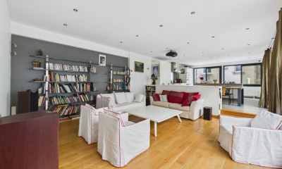 Loft de 154m2 - Paris 11ème - République/ Folie Méricourt Ancien atelier d'artiste, loft atypique de 154m2 comprenant une entrée, un triple séjour avec un puits de lumière, deux chambres, une cuisine indépendante équipée, une salle de bain, WC séparés. Rangements sur roulettes dissimulés sous les surélévations dans tout l'appartement, avec des rangements complémentaires dans chaque chambre. Verrière avec soubassement en verre sécurit acoustique et partie supérieure en polycarbonate alvéolaire isotherme, garantissant un confort thermique optimal et une très bonne insonorisation.