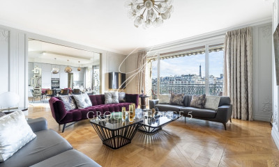 Appartement exceptionnel de 373 m² situé sur l'avenue Foch, au sein d'un immeuble du début du XXe siècle magnifiquement rénové. Installé au 5e étage avec balcons, il offre une vue imprenable sur le Bois de Boulogne, le Mont Valérien et La Défense. Cet espace luxueux comprend : - Une entrée avec toilettes invités, - Une galerie menant à de vastes pièces de réception, incluant un salon, un petit salon et une salle à manger s'étendant sur plus de 100 m², - 2 chambres avec dressing et salles de bains, - 1 chambre avec une salle de douche, - Une suite parentale avec espace salon, dressing et une salle de bains équipée de balnéothérapie et d'un hammam, - Une cuisine et des toilettes supplémentaires. L'appartement est desservi par deux ascenseurs et est entièrement modernisé avec une domotique haut de gamme et une climatisation VRV, alliant un décor moderne à des éléments classiques comme des parquets Versailles, des sols en pointes de Hongrie, des moulures et une cheminée. Les équipements supplémentaires incluent : - Un studio climatisé de 17,64 m² au 6e étage, - Des pièces de service pour la buanderie et le rangement, - Un garage fermé au premier sous-sol, - Deux caves au deuxième sous-sol.