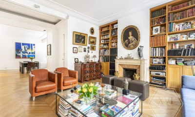 Dans un élégant immeuble en pierre de taille sécurisé, érigé en 1893 bénéficiant d'une conciergerie, superbe appartement de 124,04 m² Carrez en rez-de-jardin à l'abri des regards. Ses attributs de l'ancien, parquet en point de Hongrie, cheminée, moulures raffinées et 3,50 m de hauteur sous plafond se conjuguent avec des lignes contemporaines. Il comprend une entrée, un double séjour, une cuisine semi-ouverte, une chambre de maître avec sa salle de bains, une douche, un dressing et des toilettes, une seconde chambre avec douche et toilettes séparées offrant toutes deux une vue sur le jardin, une buanderie et des toilettes invités. Une grande cave complète ce bien. Possibilité d'acquérir un box dans l'immeuble voisin. PROFESSION LIBERALE ACCEPTEE