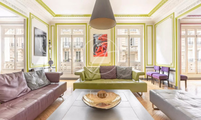 Au troisième étage d'un immeuble de standing, un appartement de huit pièces comprenant : une galerie d'entrée, une double réception avec balcon filant, une salle à manger, une cuisine séparée avec office, cinq chambres, deux salles de bains (dont une avec des toilettes), deux salles de douche (dont une avec des toilettes) et des toilettes séparées. Appartement ayant conservé tous les attributs de l'ancien, bénéficiant d'une triple exposition et d'une hauteur sous plafond d'environ 3,80 m. L'ensemble est à rénover. En annexe, deux caves. En supplément, possibilité d'acquérir deux chambres de service et deux places de parking.
