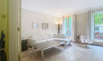 Idéalement situé à Passy, immeuble haussmannien de standing, 4ème étage sans ascenseur, appartement familial de type parquet-moulures-cheminée de 107m2 en bon état général et bien distribué. Entrée, double réception ensoleillée, cuisine équipée, dégagement, trois chambres au calme côté jardin, salle de bains, salle de douches, buanderie, toilettes. Cave. Exclusivité Breteuil.
