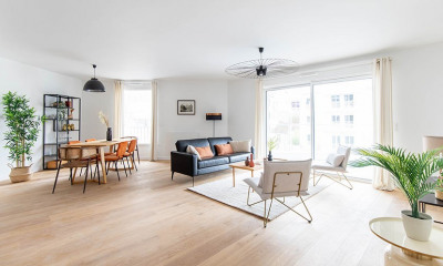 NANTES PROCÉ, Bel appartement T5 de 133 m² avec triple exposition entièrement rénové en 2023 au sein de la Résidence de la Guylhomné Grande entrée desservant un séjour donnant sur une terrasse d'angle de 30 m², cuisine aménagée équipée, trois chambres, une salle de bain, une salle de douche, deux dressings, une buanderie, wc. Une cave et un box. Environnement calme et verdoyant, résidence sécurisée de standing avec ascenseur, piscine et tennis (4.00 % d'honoraires TTC à la charge de l'acquéreur.)