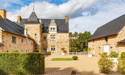 Ref.3044 : Vente château 19e en Haut-Anjou. Situé dans le département de la Mayenne, dans l' ancienne province du Haut-Anjou réputée pour sa douceur angevine, ce château est édifié à la sortie d' un village paisible. Légèrement en hauteur, il domine son joli parc à l' anglaise et un bel étang. Une petite ville assurant les services et commerces (médecins, pharmaciens, supermarchés, lycées, hôpital) est à moins de dix kilomètres. D' une surface habitable d' environ 700 m², il comprend : Au sous-sol : une vaste ancienne cuisine, la chaufferie, des caves et diverses pièces. Au rez-de-chaussée surélevé auquel on accède par un joli perron : un grand vestibule (53 m²) avec départ d' escalier, bureau (28 m²), grand salon (50 m²), bibliothèque (23 m²), salle à manger (39 m²), petite cuisine installée dans l' ancien office, petite salle à manger (25 m²), cabinet de toilette, escalier de service. La hauteur sous plafond est de 4,20 m. Ce rez-de-chaussée offre de très belles réceptions : toutes les pièces sont parquetées en chêne et ornées de beaux lambris et de remarquables huisseries en chêne à décor de serviettes pliées. Elles possèdent de beaux plafonds peints ou à caissons. Les cheminées de marbre sont toutes différentes et élégantes. Au premier étage : 7 chambres parquetées en chêne et ornées de cheminées ; 5 salles de bains ou de douche. Le second étage, parqueté en sapin, est aménageable. D'important travaux de restauration ont été réalisés ces dernières années. Une cour de dépendances édifiées en pierre et couvertes en ardoises, comprend : A l' Est : une ancienne maison d'habitation de trois pièces. Au centre : un beau bâtiment qui abrite un confortable logement avec cuisine, w-c et à l'étage : superbe loft. Garage et remise. A l' arrière : 17 boxes à chevaux. A l' Ouest : un bâtiment qui abrite un confortable appartement avec salle de séjour, cuisine, deux chambres, deux salles de bains. Sellerie et boxes à chevaux. Un hangar agricole de 300 m² environ. A l'entrée de la propriété : la porterie qui comprend un séjour, une cuisine, trois chambres et une salle de bains. D'une surface totale de 19 ha 42 a 13 ca, le terrain est agréablement disposé autour du château et légèrement vallonné. Il se compose d' un superbe parc à l' anglaise planté de grands arbres d' ornement qui fut dessiné par un grand paysagiste du XIXe siècle , de bois percés de belles allées et de prés aménagés en paddocks clôturés en bois, le tout agrémenté d' un bel étang.