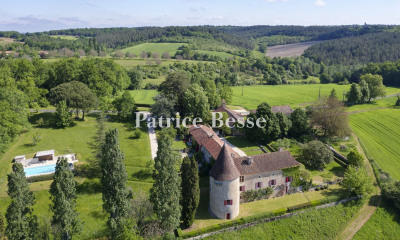En Périgord Blanc, dans un parc clos de 2 ha dominant la vallée, un logis noble de la Renaissance, son gîte et ses dépendances. Datée des 15e, 16e et 18e siècles, la propriété se dresse sur le flanc d'une colline, protégée par des bois au sud et dominant la vallée au nord et à l'ouest. Les hauts murs nord aux rares ouvertures du logis principal, les contreforts et la tour ronde de l'actuelle maison d'amis relatent son passé de château de défense. Un portail d'entrée suivi d'une allée d'arbres permet d'accéder au logis noble tandis qu'un chemin de terre longeant le court de tennis rejoint les bâtiments annexes et une piscine en contrebas d'un talus. Peu visible, un bassin de nage est bien intégré dans le parc dominant l'ensemble. Le logis est encadré par deux espaces clos offrant chacun une vue imprenable : la cour où se trouve l'entrée principale, un puits coiffé d'une toiture pyramidale, un bâtiment de dépendance faisant office d'abri de jardin, un hangar pour les véhicules, ainsi qu'un bassin contre un muret en pilastre et pierre taillée ; le tout accessible par une porte charretière, une porte piétonne et un portail récent. De l'autre côté du logis, le jardin enherbé et fleuri est accompagné d'une salle à manger d'été sous un préau.