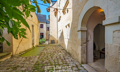 En Anjou, dans une cité de caractère, un hôtel particulier du 17 e s., avec sa cour fermée à l'avant et son jardin clos à l'arrière. L'hôtel particulier date du 17e s. Il est constitué d'un corps de logis central et de deux ailes en retour d'équerre, avec une cour pavée à l'avant et un jardin à l'arrière. L'édifice est élevé de trois niveaux et coiffé d'une haute toiture en ardoise, percée de lucarnes. Le porche est encadré par des pilastres, surmontés d'une frise ornée de triglyphes et d'un fronton curviligne avec pots à feu. Le portail ouvre sur la cour pavée, puis un escalier de pierre dessert l'entrée de l'hôtel. Le porche, la corniche, les lucarnes et l'encadrement des baies sont en tuffeau. Aujourd'hui le bâtiment est scindé en deux. Seule une partie du logis central, la plus importante et l'aile en retour d'équerre située à l'est, la plus conséquente, sont proposées à la vente. Le porche d'entrée et l'essentiel de la cour pavée font également partie du bien.