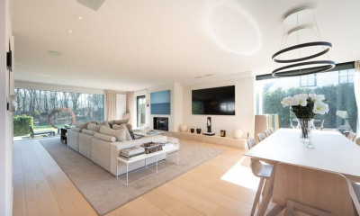 Villa de nouvelle construction offrant des vues uniques et de généreux volumes, développant une superficie totale d'environ 306 m², nichée dans un environnement verdoyant à la lisière du Zoute, à proximité du Vieux Moulin. Le rez-de-chaussée d'une superficie totale d'environ 100m² s'ouvre sur un hall d'entrée spacieux avec vestiaire et toilettes invités. L'espace de vie, particulièrement lumineux, comprend un salon et salle à manger dotées de larges baies vitrées minimal windows et d'une belle hauteur sous plafond, offrant des vues imprenables sur les polders. La cuisine ouverte, luxueusement équipée, dispose d'un agréable coin petit-déjeuner. Le premier étage développe une surface d'environ 97m² et accueille trois belles chambres doubles, toutes dotées de placards encastrés et de leur propre salle de bain ou salle de douche. La chambre principale dispose d'une salle de bains attenante avec double lavabo, baignoire, douche à l'italienne et toilettes séparées. Les deux autres chambres disposent chacune d'une salle de douche. Des toilettes séparées se trouvent dans le hall de nuit. Le deuxième étage, d'une superficie d'environ 40m², comprend une quatrième chambre spacieuse avec armoires encastrées, une salle de douche (lavabo et douche à l'italienne), ainsi que des toilettes séparées. La villa dispose d'un sous-sol complet de près de 70m² et offre une grande salle polyvalente, des toilettes séparées, une buanderie et un local technique. Cet espace peut aisément être aménagé Ref: 'SKN_PUB_7451866'