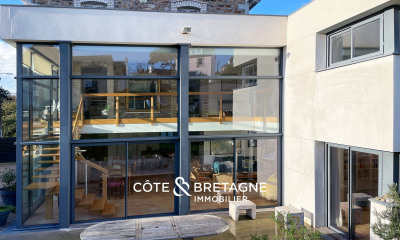 À Carantec, en baie de Morlaix, à 100 m de la plage, une villa du 19e s , avec dépendance et jardin. Dans un quartier résidentiel aux ruelles bordées de jardins fleuris, la propriété est située à moins de 100 m à pied d'une plage de sable blanc. En retrait de la route, l'ensemble est dissimulé dans les massifs d'hortensias. Un accès conduit directement au garage. Construite à la fin du 19e s., la villa remonte à l'âge d'or du tourisme balnéaire en Bretagne. Elle est élevée de trois niveaux sous combles et coiffée d'une toiture mansardée à deux versants, de forme convexe, percée de baies. L'édifice a été bâti en moellon, suivant un plan rectangulaire. Les encadrements des baies sont en pierre de taille. Au centre de la façade, l'entrée est accessible par une volée de marches qui mènent à un perron, jusqu'à une haute porte cintrée et vitrée. L'arrière de la maison est prolongé d'une avancée, elle aussi éclairée de baies, qui ouvrent vers le jardin. Une dépendance et un appentis, en retour d'équerre, sont attenants et desservis par des accès indépendants.
