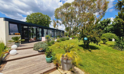 Coup de coeur assuré pour cette maison idéalement située à 1km du bourg et 2.5km des plages. Maison de 166m2 rénovée avec goût et matériaux nobles. Vie de plain-pied, chambres avec belles hauteurs sous plafond. Local commercial. Grand garage de 50m2 avec mezzanine, possibilité de 2éme habitation pour du locatif. Jardin paysagé.