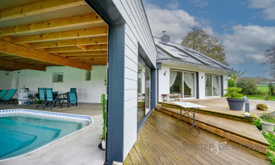 Immobilier.notaires® et l'office notarial CARADEC-VASSEUR et associée, SELARL vous proposent : Maison / villa à vendre - PLOUIDER (29260) - - - - - - - - - - - À moins de 1,5 km des plages de Keremma, 5 mn de Lesneven, 10 mn de Plouescat et 30 mn de Brest, découvrez cette propriété rare sur le marché offrant confort et volumes (240 m2 habitables) dans un cadre unique sur 1.2 ha de terrain avec étang et vue dégagée. Au Rez-de-chaussée : l'entrée mène à un vaste espace de vie lumineux de 53 m² exposé sud-ouest équipé d'une cheminée double face et ouvert sur la terrasse en bois sans aucun vis-à-vis avec vue dégagée sur l'étang. La pièce de vie centrale communique avec d'une part une cuisine aménagée et équipée moderne disposant d'une arrière cuisine, et d'autre part avec un espace piscine couvert de 125 m² disposant d'un bassin de 10x6 chauffé par pompe à chaleur, donnant sur la terrasse en bois. Ce niveau dispose en complément de WC indépendants, 3 chambres, bureau, salle d'eau avec WC pour une vie de plain pied (possibilité de création d'un logement indépendant). A l'étage : 3 chambres, salle de bains avec baignoire & douche, WC indépendant. Hangar indépendant équipé en eau et électricité avec espace garage, atelier. Prestations techniques Maison raccordée au réseau électrique + panneaux solaires avec batteries 9 kW. Autonomie en eau grâce à une source filtrée et stockée en cuve (eau potable). Assainissement en cours de raccordement au tout-à-l'égout. Extérieurs Terrain de 1,2 ha, dont une partie arborée avec verger. Étang privatif de 500 m² peuplé de poissons, environnement verdoyant et calme, à proximité immédiate du littoral. Une maison familiale et conviviale, idéale pour profiter d'un cadre de vie exceptionnel entre terre et mer. Bien rare sur le marché. - - - - - - - - - - - Visites : Sur rendez-vous. Contact : - - - - - - - - - - - Annonce de l'étude CARADEC-VASSEUR et associée, SELARL - Notaires à Plouescat - N° SIRET : 92104300600011 - - - - - - - - - - - Immobilier.notaires® : Evaluer, acheter & vendre avec les notaires partout en France. 12 000 notaires, experts et négociateurs vous accompagnent dans vos projets immobiliers en toute confiance.