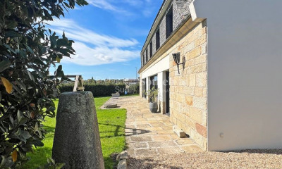 Cet ensemble de maisons se découvre au bout d'une allée, au calme, dans un environnement verdoyant, lumineux. La mer se dessine en toile de fond pour vous rappeler qu'elle est toute proche. Autour d'une grande maison principale, construites en pierre sous chaume ou ardoise naturelle, s'entremêlent trois longères, une chaumière et des écuries. Descriptif : La première partie dispose d'une vaste cuisine équipée avec espace dinatoire, d'un salon avec cheminée, d'un deuxième salon pouvant être revisité, d'un wc. A l'étage, trois chambres ainsi qu'une suite parentale avec dressing et salle d'eau-wc, un joli coin bureau. L'étage se complète avec une salle de bains et un wc. La deuxième maison se compose d'un vaste salon-séjour ouvert sur une cuisine, d'une chambre, d'une salle d'eau au rez-de-chaussée et d'un wc. A l'étage, trois chambres, une salle d'eau et un wc. Une longère double propose deux habitations à la disposition identique, à savoir au rez-de-chaussée une pièce de vie avec cuisine, un wc; à l'étage, deux chambres, une salle d'eau et un wc. La cinquième maison offre une grande pièce de vie avec cheminée et cuisine ouverte, une salle d'eau et un wc. La chambre se trouve en mezzanine. Au dessus des écuries, un appartement a été aménagé avec une pièce de vie avec cuisine, une chambre, une salle d'eau et un wc. La propriété a plusieurs dépendances et même un puits. La superficie du bâti est de 650 m². L'ensemble est entièrement rénové. Environnement : Au calme, sans voisin, la propriété est entourée par ses terres; les plages et commerces sont à 5 minutes. (3.31 % d'honoraires TTC à la charge de l'acquéreur.)
