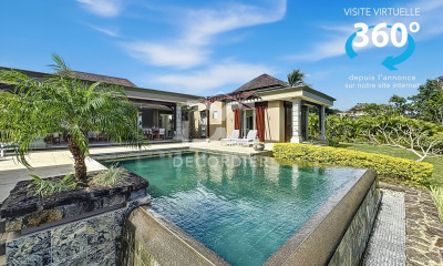 Cette charmante villa de 350 m² sur un terrain de 1 112 m² composée de 4 chambres se trouve dans un lotissement paisible. Elle offre un espace de vie très confortable donnant sur une terrasse avec vue sur sa piscine privée et un beau jardin tropical. La villa se compose au rez-de-chaussée d'une grande cuisine moderne bien équipée donnant sur une salle à manger spacieuse, une chambre en suite avec un salon privatif. À l'étage se trouve 3 chambres toutes en suite et une belle terrasse au toit en chaume récemment rénové. Elle dispose également d'un garage qui se transforme aisément en terrasse bien aérée, d'une tonnelle de jardin au toit en bardeaux, d'un abri de jardin, d'un coin de service et d'une cour intérieure pavée comptant 6 espaces parking.