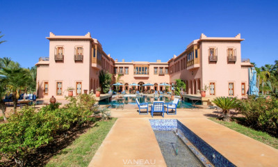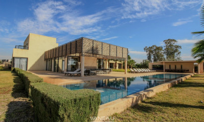 Golf d'Amelkis. Située en première ligne du golf sur un terrain d'environ 1200 m², villa d'architecte de 600 m² sur 2 niveaux avec piscine. Vues panoramiques sur les montagnes de l'Atlas et le Golf. Architecture unique conçue avec des matériaux haut de gamme. Au rez-de-chaussée : triple réception lumineuse avec cheminée, salle à manger, cuisine indépendante et toute équipée. Suite avec dressing et salle de bain. À l'étage : 4 suites avec dressing, salles de bain et terrasses. Dépendances pour le personnel. À moins de 20 minutes du centre de Marrakech. Honoraires acquéreur 3% TTC en sus du prix de vente.