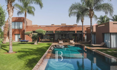 Exclusivité. Marrakech - Au cœur du Triangle d'Or de la Palmeraie, villa de 2000 m2 sur un parc arboré de plus de 2 hectares avec piscine et bassins d'eau. ?1 entrée cathédrale et 1 entrée de service.? Au rez-de-chaussée: double réception, salon marocain, salon japonais avec salle à manger, bar anglais, salon TV. Décoration raffinée, matériaux d'exception et prestations haut de gamme. 4 suites luxueuses avec chacune une terrasse privée et un accès direct à un bassin d'eau. Cuisine indépendante toute équipée. A l'étage: master bedroom avec salle de sport et terrasse avec vues panoramiques sur toute la Palmeraie. ?Terrasses et piscine (21 x 16) donnant sur le jardin. ?Un étage dédié à un espace de bien-être complet avec sauna, hammam, salle de vapeur et salle de repos. ?Au sous-sol : cuisine professionnelle et logements pour le personnel. Stationnement pour 8 véhicules. Propriété vendue meublée.