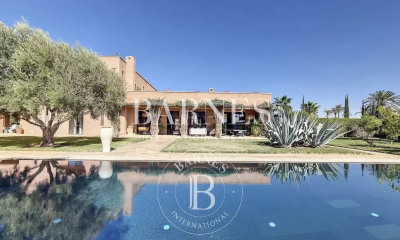 À moins de dix minutes de la Médina, de Guéliz et de l'Hivernage, cette somptueuse villa d'environ 550 m² s'inscrit au cœur d'un jardin paysager de près de 2 000 m², au sein du prestigieux domaine privé Les Parcs de l'Agdal, imaginé par Simon-Xavier Guerrand-Hermès. Conçue majoritairement de plain-pied, la propriété est nichée dans un écrin de verdure luxuriante et séduit par une architecture élégante, empreinte de caractère et d'authenticité. Le rez-de-chaussée s'articule autour d'un vaste espace de réception comprenant deux salons, dont un salon marocain, ainsi qu'une salle à manger, l'ensemble s'ouvrant harmonieusement sur les terrasses, le jardin et la piscine. L'espace nuit accueille trois chambres, chacune disposant de sa salle de bains, de son dressing et de sa terrasse privative. Ce niveau est complété par une cuisine entièrement équipée, une buanderie ainsi qu'une chambre de service. À l'étage, la suite parentale offre une salle de bains et un dressing, et bénéficie de terrasses avec de superbes vues dégagées sur le jardin, la végétation environnante et la chaîne de l'Atlas. Le domaine met également à disposition de ses résidents deux piscines communes, un terrain de padel, une salle de squash, une salle de sport ainsi qu'un espace dédié aux enfants. La villa dispose par ailleurs d'une chambre de gardien et d'un espace de stationnement. Situé au sud de la ville, ce quartier résidentiel d'exception longe les célèbres jardins de l'Agdal et accueille de nombreux établissements hôteliers et restaurants. L'avenue Mohammed VI, qui le traverse, permet un accès rapide à la route de l'Ourika. Pour tout renseignement complémentaire, veuillez contacter David Montérin au +212 6 71 43 72 27.