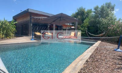 Maison contemporaine d'exception située dans un quartier récent et recherché d'Andernos-les-Bains. Cette propriété séduit dès l'entrée par ses volumes généreux et sa luminosité omniprésente. La pièce de vie, élégante et conviviale, accueille un vaste séjour avec une cuisine ouverte aménagée et équipée, aux prestations soignées. Un cellier attenant complète cet espace de vie fonctionnel. L'espace nuit se compose de trois chambres, dont une suite parentale offrant une salle de bains complète et un dressing, ainsi qu'une salle d'eau indépendante. Un garage de près de 37 m² vient parfaire l'ensemble. Implantée sur un terrain paysagé, la maison dispose d'une agréable terrasse et deux pergolas idéales pour profiter des beaux jours en toute intimité. Prestations de qualité : chauffage au sol, matériaux choisis avec soin, confort moderne. Une maison clé en main, alliant élégance, confort et qualité de vie. Prix : 920000.0 euros, Net vendeur : 890000.0 euros , Honoraires charge acquéreur : 3.38 %TTC. Montant estimé des dépenses annuelles d'énergie pour un usage standard entre 600.0 € et 860.0 € indexées aux années 2021, 2022, 2023 (abonnements compris).